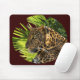 CLOSEUP OF LEOPARD SILHOUETTED BY SUNLIT PALM LEAVES ON MOUSE PAD. DIGITAL PHOTO BY LARRY SIMONS.