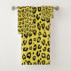 Wild Leopard animal print pattern bathroom towel set. Exotic safari print design with yellow or custom color background. Elegant home decor for bathroom, toilet, guest house, cabin etc. Includes little washcloth, small hand towel and big bath towel. Holiday gift ideas for friends, family, couple, newlyweds etc. Add your own monogram or family name optionally.
