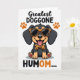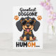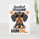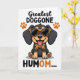 This greeting card features a cartoon-style puppy sitting against a white background, looking straight ahead with a friendly, affectionate gaze ❤️. The pup has dark fur with golden-tan markings, a wide grin, and a pink tongue showing, like it’s sharing a happy moment with someone it trusts. Orange-framed sunglasses add a cool touch, while a leopard-spotted bow tie hints at a fun, dressy personality that feels close and companionable. Near the top, the phrase “Greatest DOGGONE” is placed in a flowing, cursive-like lettering style, with two orange paw prints on either side like little cheers. The warm orange accents tie the text to the pup’s accessories, keeping the look coordinated and easy on the eyes. Along the bottom, “HUMOM…” appears in thicker orange letters, set apart so it reads like a fond nickname 🌼. The final layout shows the puppy centered, the top words arcing above its head, and the orange paw prints sitting to the left and right of the top line.