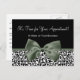 A trendy black and white leopard print hair and beauty salon appointment reminder postcard with an elegant dark green ribbon tied into a stylish bow. Personalize this classy animal print design by adding the name of hairstylist or beautician. Flat printed image, not actual bow.