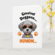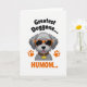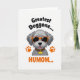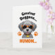 This card shows a friendly, human-like grey dog shown from the chest up, with soft fur shading and a slightly cheeky tongue peeking out that feels like a warm inside joke ❤️. Oversized orange sunglasses sit across its face, giving it a confident, affectionate look, as if it’s posing for someone it adores. The background stays plain white so the grey, orange, and yellow details stand out clearly. Near the top, slightly angled black text reads “Greatest Doggone...” and it hovers above the dog’s head. Below, large orange text finishes the phrase with “HUMOM...” in a matching warm tone, like a bright little shout of appreciation 🌼. Two orange paw prints sit on either side of the lower part of the dog’s head, balancing the layout. Around its neck is a leopard-pattern collar with a bright yellow, bone-shaped tag that pops against the neutral fur.