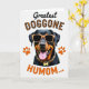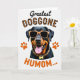 This card shows a dark-furred dog centered on a white background, with warm rust markings that frame its face and legs. Bright orange sunglasses sit across its eyes, giving it a friendly, flirty edge, and its open mouth with a pink tongue makes it look like it’s grinning at someone it trusts ❤️. Above the head, the word “Greatest” appears in flowing black lettering near the top. Just below, “DOGGONE” is set in large uppercase letters filled with a leopard-style pattern, adding a fun contrast against the dog’s sleek coat. Around the neck, a patterned collar with a small bone-shaped charm hints at a close bond, like a little gift worn proudly. Near the bottom, “HUMOM...” is printed in orange, with two matching orange paw prints on either side 🌼. The orange accents repeat in the sunglasses, the bottom text, and the paw prints, standing out sharply against the white space.