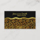 These trendy business cards feature a splotched leopard print pattern with black animal spots on an orange-yellow-gold fur background, below a gold wavy line and a black space to add your information. The back is similar, with the design diagonal and more space for business info. Bring out the wild cat in you with this cool feline design. It's the perfect bold, original look for animal lovers / anyone wanting a sleek, modern look. Just fill in the templates or click "Customize It" to resize text, change font or color. Check our shop for matching items.