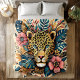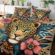 A stunning duvet cover showcases an intricately designed leopard's face surrounded by colorful foliage and flowers, creating a vibrant and artistic centerpiece for any bedroom decor.