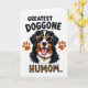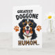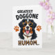 This card features a cheerful portrait of a domestic dog centered on a bright white background, its tricolor coat shown in deep black, snowy white, and warm auburn. The dog’s open-mouthed grin, with a pink tongue and a peek of small white teeth, feels like it’s aimed at a favorite person with friendly affection ❤️. Golden-yellow sunglasses sit across its snout, giving it a relaxed, confident look that reads like a fun inside joke between close companions. A red collar wraps its neck with a small golden tag that catches the eye like a tiny token of care. Two stylized paw prints in earthy orange sit to the left and right of the dog’s head, framing the face like supportive little cheers 🌼. At the top, the phrase “GREATEST DOGGONE” appears in rounded black lettering, while the bottom line reads “HUMOM...” in a leopard-style patterned fill that stands out against the white space. The layout keeps the dog in the middle, with the paw prints flanking it and the two lines of text stacked above and below for a balanced, graphic look. The sunglasses are a warm yellow-gold, and the paw prints are a soft orange set evenly on both sides of the dog’s face.