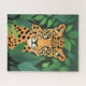 Puzzle in a leopard with bright, intense eyes peering through lush green foliage. The sharp contrast between the leopard's spotted fur and the vibrant leaves creates a striking visual effect.