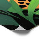 Print in a leopard with bright, intense eyes peering through lush green foliage. The sharp contrast between the leopard's spotted fur and the vibrant leaves creates a striking visual effect.