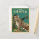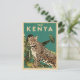 Unique Antique Style Aviation Travel poster from Kenya featuring a spotted Leopard or panther painting amongst tropical leaves on an deep Aqua blue background