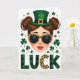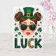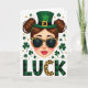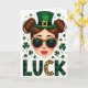 This greeting card features a modern St. Patrick’s Day illustration centered on a stylish woman shown from the shoulders up, with rosy cheeks and glossy red lips that hint at a flirty, confident smile. Her brown hair is styled into two neat buns, and an emerald green leprechaun hat with a gold buckle and a four-leaf clover sits slightly tilted, as if she’s posing for someone special. Leopard-print sunglasses add a cheeky edge, giving the impression she’s sharing an inside joke with a close friend. Around her, deep green shamrocks and small gold confetti-like dots drift across a bright white background, creating a light, festive setting ☘️. Near the bottom, the word “LUCK” is placed in large letters, with the text standing out clearly against the white space. The “L” and “K” use a green-and-black plaid pattern, while the “C” repeats the leopard print from the sunglasses for a tied-together look 💚. The hat’s clover is a rich green accent, and the golden buckle catches the eye with a warm metallic tone.