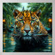 Striking, close-up view of a large leopard with a vividly marked face, combining elements of both a tiger and a jaguar. Its vibrant orange and black fur contrasts with the lush green foliage that surrounds it. The cat has piercing green eyes that draw attention, set against the backdrop of a calm, glistening waterway. Soft, atmospheric lighting illuminates lanterns and tropical plants, creating an enchanting and mysterious ambiance. Overall, the composition exudes a sense of majesty and intrigue, blending wildlife with a serene, picturesque environment.