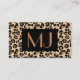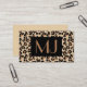 Business card in a textured leopard pattern - leopard spots in black, accented with rust, on a tan / beige background with monogram