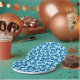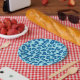 Paper plates in a leopard animal print in dark denim blue, accented with medium blue, on a pastel blue background
