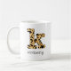 Personalize this custom leopard print lowercase letter "k" coffee mug by adding a name. The custom name is in a girly handwritten type font.