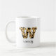 Personalize this custom leopard print lowercase letter "w" coffee mug by adding a name. The custom name is in a girly handwritten type font.