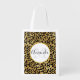 Grocery tote with a stylish pattern. Exotic black leopard spots on a gold background. Wild yet elegant style. A white colored circle frame with a faux gold foil borders layered over top with your personalized name and monogram initial inside.
