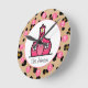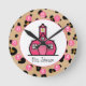A clock featuring a leopard print design and the logo of The Pink Schoolhouse. Personalize with your name under schoolhouse. Clock features white numbers on pink dots.