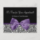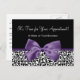 A trendy black and white leopard print hair and beauty salon appointment reminder postcard with a girly purple ribbon tied into a cute bow. Personalize this stylish animal print design by adding the name of hairstylist or beautician. Flat printed image, not actual bow.