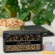 Leopard Skin Design made with brown leopard spots inside the big cat paw prints on a black colored background. The center is left for personalization / personalize surrounded with white diamond rhinestones. (Photo Printed).