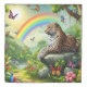A stunning leopard reclines on a rocky perch amidst lush greenery, surrounded by colorful butterflies and blooming flowers, with a radiant rainbow arching across the sky.