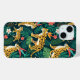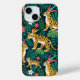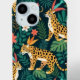 Leopards wearing feather headdresses, surrounded by tropical flowers and leaves in a dense jungle setting, vibrant colors, playful design.