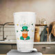Leprechaun Clover Shamrock Patrick's Day Glass. A festive St. Patrick’s Day-themed glass featuring a illustration of a cheerful man. The man wears a green hat with a black band and a gold buckle and has a bright red beard. His face has a friendly expression with a smile. The glass is surrounded with green and orange shamrocks.
