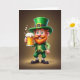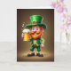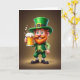 This card shows a classic leprechaun standing front and center against a soft, gradient brown background, dressed head to toe in emerald green with a tall top hat and a golden buckle. His glossy jacket and trousers catch the light, while his fiery orange beard and matching brows frame a wide grin and rosy cheeks that feel like a friendly wink. Big green eyes shine with a welcoming look, as if he’s raising a toast to someone close 💚. In his right hand, he lifts a mug of golden ale, crowned with a thick white foam where tiny bubbles float upward like little sparks ☘️. Gentle light and shadow shape his rounded face and sturdy stance, making him look warm and approachable rather than distant. A short St. Patrick’s Day greeting sits near the top in green lettering, with a smaller line beneath it in gold. Small details—pointed ears, simple black shoes, and the soft glow on the beer—stand out against the smooth brown backdrop.
