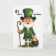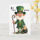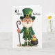 This card shows a cheerful leprechaun standing in the center against a wide white background, smiling as if he’s just spotted a good friend. He wears emerald green from head to toe, including a tall hat with a four-leaf clover and matching coat and trousers, with buckled boots finished with yellow laces. His rosy cheeks, shiny eyes, and full white beard frame a big grin that feels welcoming and a little flirty in its friendly confidence 💚. In one hand he holds a gnarled wooden staff with a curled top, and in the other he steadies a black pot tipped slightly forward, spilling gold coins. The gold coins gleam in warm yellow tones that stand out against the greens, like a shared secret being offered to someone close ☘️. Across the top, the phrase “If I were a leprechaun,” appears in a thin, flowing dark green font, centered above his hat. The staff’s spiral tip and the coin pile are drawn with crisp highlights, and the pot’s rim is outlined in deep black with small reflections.