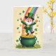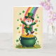 The front design shows a smiling leprechaun in a green suit and top hat, standing with arms wide on a deep emerald pot spilling over with shiny gold coins 💚. His white beard, rosy cheeks, and bright buckle draw your eye, and his open stance feels like he’s welcoming a close friend into the scene. A broad rainbow arches behind him ☘️, stretching across a soft gradient sky that fades gently from light to deeper tones. Small coins and shamrocks float around him, as if caught in a light breeze, adding motion that feels like a shared laugh mid-celebration. Near the top, St. Patrick’s Day text sits centered in a light-colored font that contrasts clearly against the background. The pot rests on stylized green grass at the bottom, giving the scene a grounded base beneath the swirl of falling coins. The rainbow bands are layered in clear stripes, curving from one side of the card to the other behind the leprechaun.