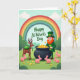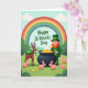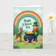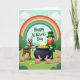 This card shows a smiling leprechaun in a green outfit and tall hat leaning over a large dark cauldron that’s spilling shiny gold coins onto emerald grass. With one hand he flicks a coin into the air, and his bright eyes seem to meet the curious gaze of a small group of pink rabbits gathered at his feet. Nearby, a brown deer stands calmly with a green scarf and satchel, angled toward the leprechaun like a loyal friend keeping close beside him 💚. Above them, a wide rainbow arcs across a soft blue sky with puffy white clouds, adding a gentle glow to the scene ☘️. Green leaves and plants frame the sides and bottom, creating a cozy woodland setting around the characters. The words “Happy St Patrick’s Day” appear beneath the rainbow in dark lettering, centered so they sit right over the main scene. Gold coins scatter across the grass in front of the rabbits, with a few more glinting at the rim of the cauldron.