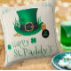 This St. Patrick's Day throw pillow features a Leprechaun's top hat in glorious green with scattered coins from his pot o' gold with the text 'Happy St. Paddy's. The trendy design in green and gold is highlighted by shamrocks on an off-white, grunge background. Search ID636 to see coordinating products for this design.