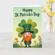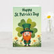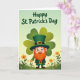 This card features a smiling cartoon leprechaun standing front and center, looking out with bright, friendly eyes that feel like an invitation to celebrate with someone close 💚. He wears an emerald-green suit and a tall green top hat with a shiny gold buckle, while his orange beard and mustache add a warm contrast around his grin. Behind him sits an oversized four-leaf clover, softly shaded in rich greens like a lucky backdrop framing his face. The background fades from pale spring green at the top into a warmer green near the bottom, giving the scene a gentle, outdoorsy glow. Along the lower edge, small orange flowers and simple blades of grass scatter across the foreground, adding a sweet, garden-like setting that suits friends or sweethearts strolling together ☘️. The words “Happy St. Patrick’s Day” curve across the top, set in rounded, bubbly letters with a deep green outline. The leprechaun’s hat buckle and suit buttons catch the light in small golden highlights, while the clover’s rounded leaves sit like a soft halo behind him.