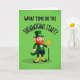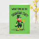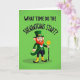 This greeting card features a stylized leprechaun centered on a glowing green background, setting a lively St. Patrick’s Day scene ☘️. He wears an emerald coat and a matching top hat with a gold buckle, and his rosy cheeks sit above an orange beard and curled mustache that give him a friendly, slightly mischievous look. A slim black cane rests in his hand, topped with a shiny gold coin marked with a dollar sign, like a little secret he’s letting you in on. His bright yellow boots curl at the toes, adding a jaunty touch that feels like he’s mid-step toward a fun night out. Above his head, the line “WHAT TIME DO THE SHENANIGANS START?” curves in black letters across the top, standing out sharply against the green. The open, direct question reads like a cheeky nudge between close friends, as if he’s inviting someone special to join him 💚. A soft radial glow spreads outward behind him, keeping the green field bright and focused around the character. Share St. Patrick’s Day sentiments with someone who’d grin at the arched black text above the leprechaun’s hat and the gold coin shining at the tip of his cane.