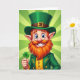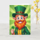 This St. Patrick's Day card features a close-up portrait of a friendly leprechaun centered on the front, leaning in as if he’s sharing a private joke with you 💚. He wears an emerald green top hat with a brown band and a gold buckle, along with a green jacket trimmed with small gold touches over a sunny yellow shirt. His thick orange beard and mustache frame a wide smile with bright white teeth, and his sky-blue eyes sparkle with a teasing, affectionate look. In his right hand, he holds out a green three-leaf clover ☘️, angled toward the viewer like a small gift between friends. Behind him, a lime green background radiates with sunburst lines that spread outward and make the whole scene glow. The greeting text sits near the top in a light yellow-green color, standing out against the brighter backdrop without covering his hat. Gold accents on the hat buckle and jacket details catch the light against the green rays in the background.