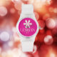 This bold design features a simple white flower with the words "Lesbian AF" underneath, set against a vibrant hot pink background. The minimalist flower contrasts beautifully with the striking pink, creating a powerful yet elegant statement. Designed on a clear silicone strap watch, this piece is perfect for those who want to express their pride with both style and confidence.