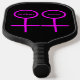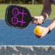 This awesome Pickleball Paddle is designed for lesbians. It features two pink female symbols standing side by side. The background is black and there is customizable pink text inside each of the symbols to put names. There is also custom text on the back to include names or a message.