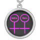 This cute necklace is designed for lesbians. It features two pink female symbols standing side by side. The background is black and there is customizable pink text inside each of the symbols to put names