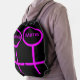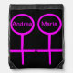 This awesome drawstring backpack is designed for lesbians. It features two pink female symbols standing side by side. The background is black and there is customizable pink text inside each of the symbols to put names.