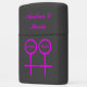 This awesome lighter is designed for lesbians. It features two pink female symbols standing side by side. The background is black and there is customizable pink text inside each of the symbols to put names.