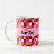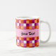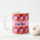 Personalized mug with a checkerboard seamless pattern in the colors of the lesbian pride flag; orange, white, and pink pride design; with custom text template for your name or message
