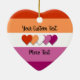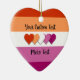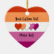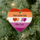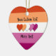 Ceramic Christmas ornament shaped like a heart with the lesbian pride flag with five hearts in the center of the design. Pink, white, and orange flag of the lesbian pride movement; with an editable text field for your name or message; a great way to decorate your Christmas tree :D