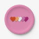 Paper plates with hearts in colors of lesbian pride flag, pride design on a pink background; orange, white, and pink hearts
