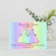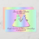 Two brides hold hands in this colorful Save the Date pre-invitation card for a lesbian wedding. Their aspect, and the background, is the rainbow of Gay Pride in pastel shades. Alert your family and friends that they might clear their calendar for your big day.