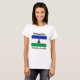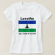On the front of this shirt an editable title and slogan accompanies the Basotho flag with its black symbol on white between blue and green horizontal bands. The back displays a detailed map of Lesotho.