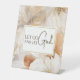 Christian pedestal sign depicts a beautiful floral watercolor design with white flowers and gold accents. It features a powerful Christian inspirational quote, "Let go and let God."