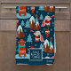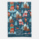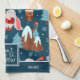 Add a cute seasonal touch to your holiday baking and cooking with this adorable custom blue and white kitchen towel. Towel has a pattern of a festive brown bear ice skating, an owl wearing a Santa hat and glasses, a bird on a snowy mountain, a bunny playing a trumpet, and Christmas trees in the snow. Center text says I don't know let it snow. Add your family last name for a personalized touch.