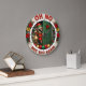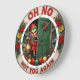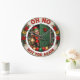 This image features a circular wall clock with a humorous, non-traditional Christmas theme. The central illustration shows an angry-looking elf peering out from a partially opened green door, holding an antique lantern. The clock face is surrounded by a white ring containing the black hour markers and clock hands. The border features festive greenery, poinsettias, candy canes, and large red and gold ornaments. Humorous red text is boldly displayed at the top and bottom: "OH NO" (at the top) and "NOT YOU AGAIN" (at the bottom).