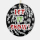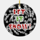 A black sky with lots of swirling snowflakes and traditional red, white, and green text that reads "Let it Snow!" on a holiday keepsake ornament.