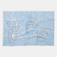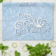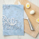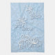 Blue kitchen towel with swirling snowflakes and the words, "let it snow."