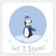 A penguin wearing a blue hat and scarf stands in the snow and watches the snowflakes fall. This design is available on multiple products including shirts, mugs, pillows, and more! It can be customized or personalized by adding your own text or images!