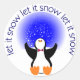 Cute penguin with red bow tie celebrates winter and winter sports with Let It Snow banner across the sky.